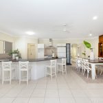 Centrally positioned, the kitchen is a standout. Cleverly designed with walk-through pantry access from the double lock-up garage, it offers extensive bench space, a dishwasher, pan drawers, microwave shelf, five-burner gas cooktop, built-in glass display cabinetry, and views over the pool-making it as practical as it is inviting.