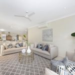 The home then opens into an oversized open-plan living area, where your eye is immediately drawn through to the seamlessly integrated indoor-outdoor living spaces beyond. Fully tiled and air-conditioned, this generous living zone is complemented by plantation shutters and flows effortlessly out to the entertaining area and sparkling in-ground pool.