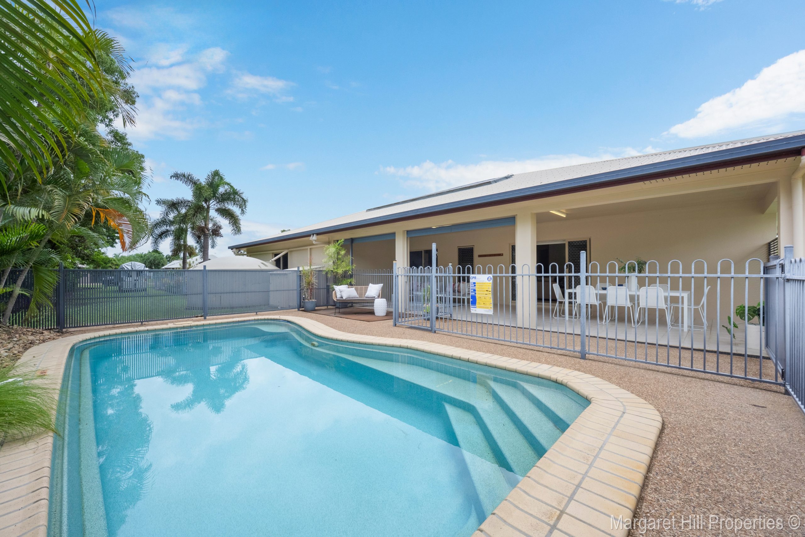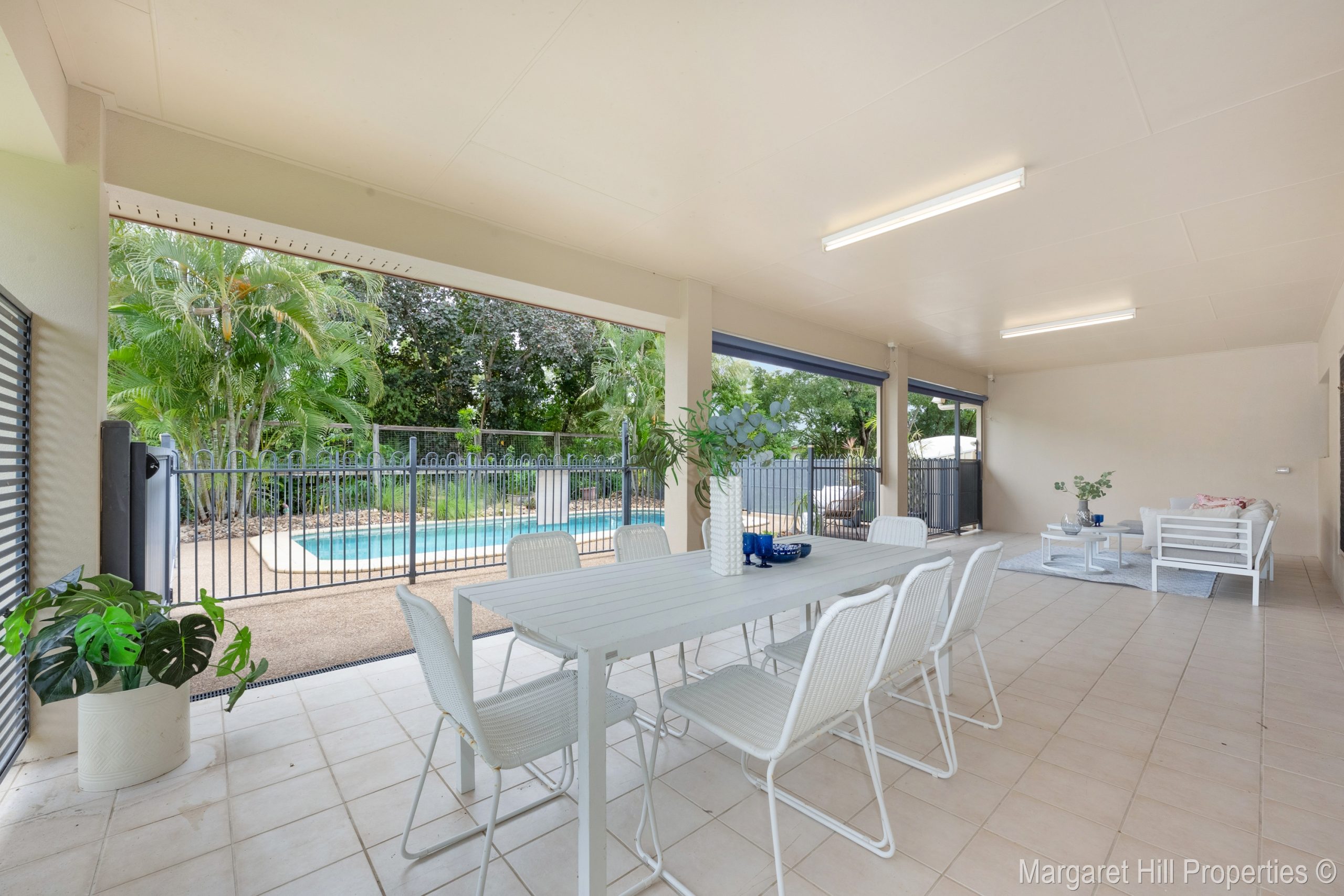 Externally, the tiled entertaining area runs the full length of the living room, providing the perfect space to relax, entertain, and enjoy the pool.
