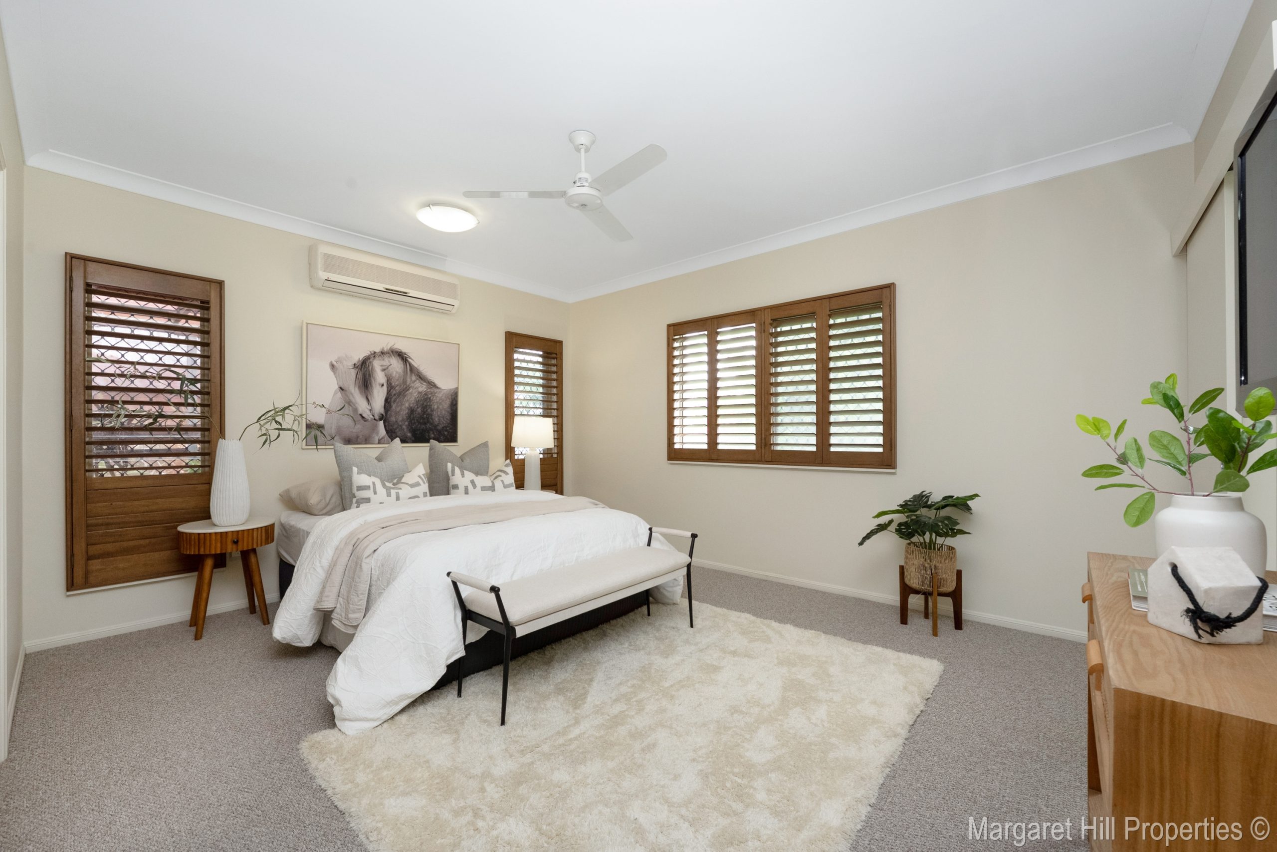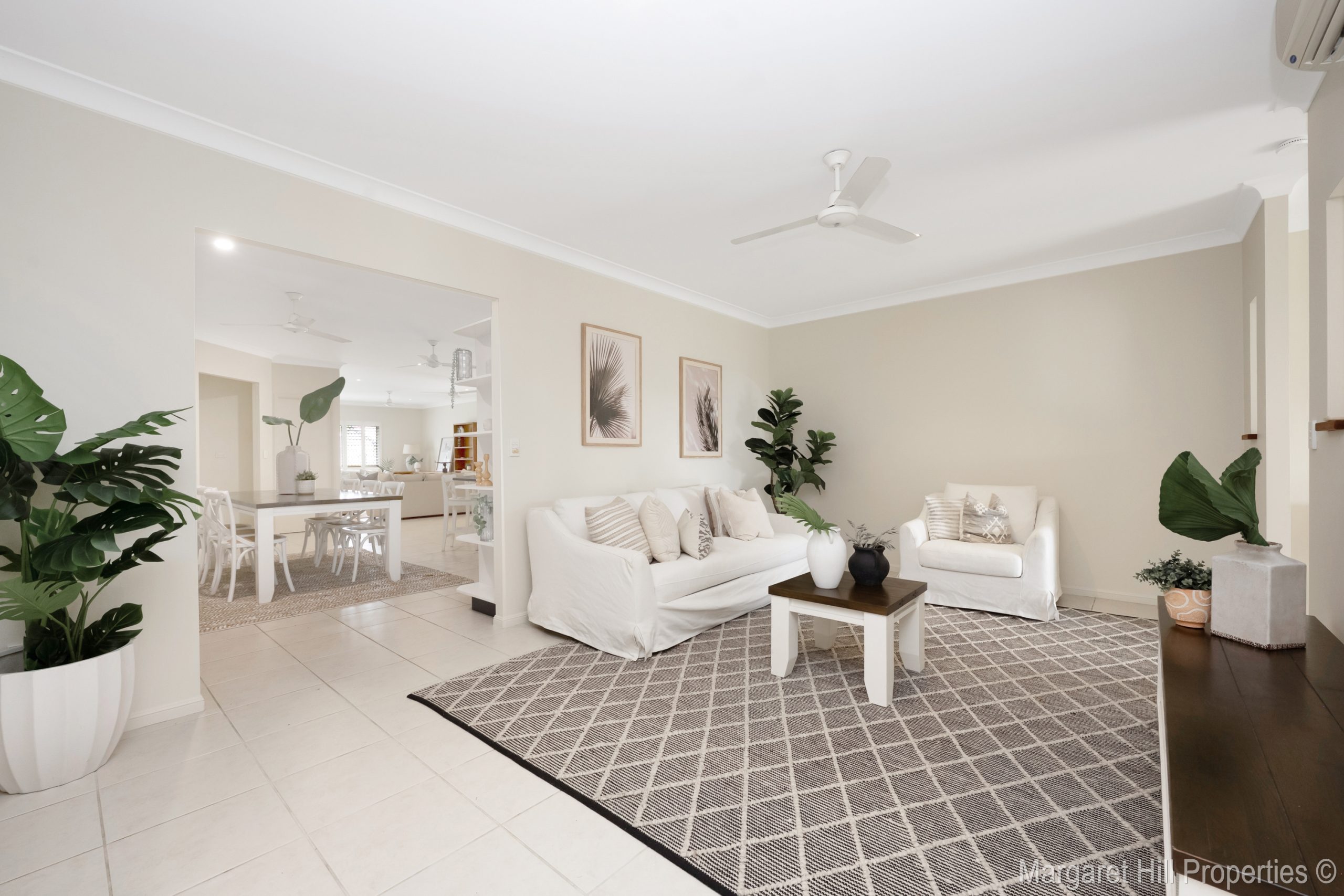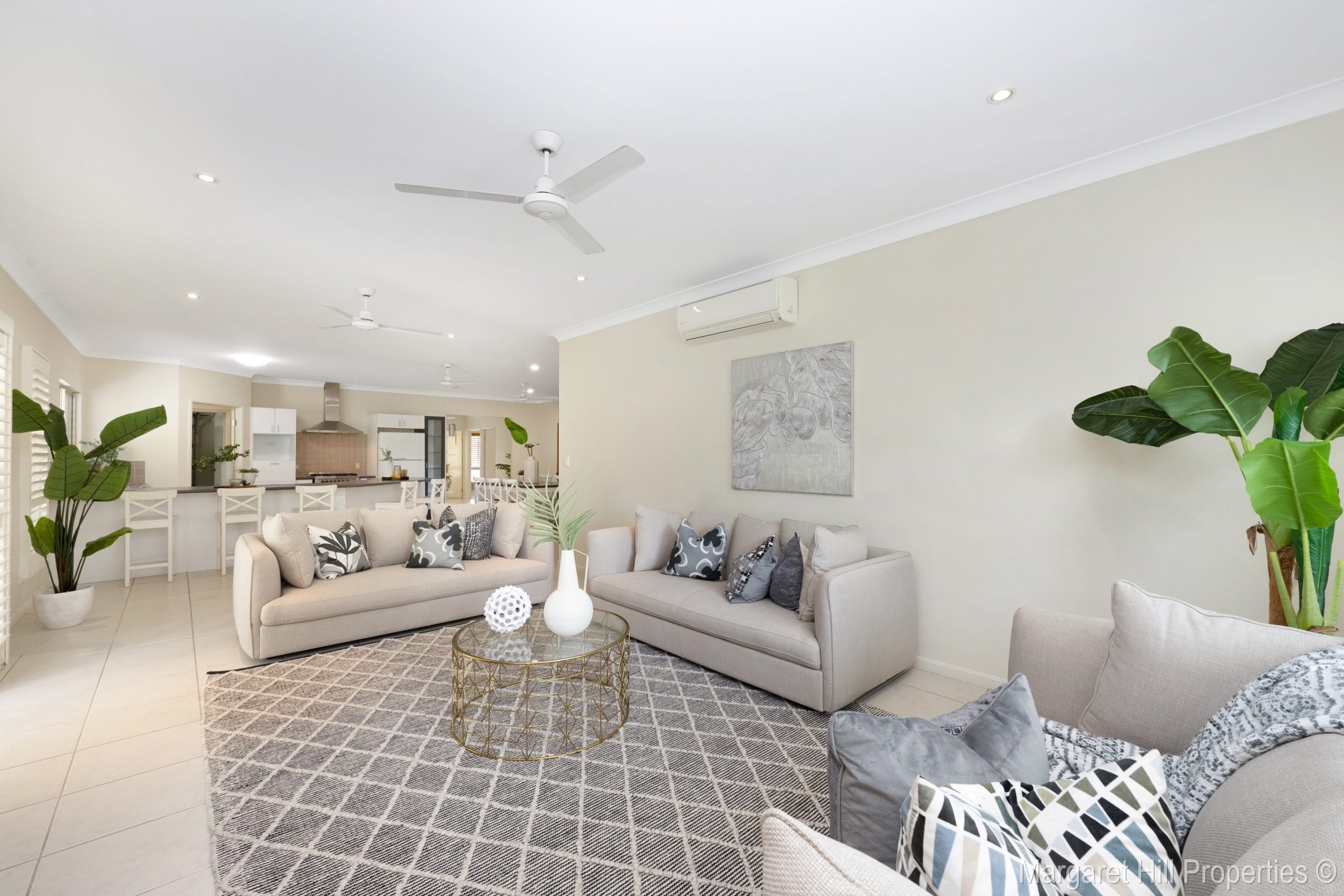 The home then opens into an oversized open-plan living area, where your eye is immediately drawn through to the seamlessly integrated indoor-outdoor living spaces beyond. Fully tiled and air-conditioned, this generous living zone is complemented by plantation shutters and flows effortlessly out to the entertaining area and sparkling in-ground pool.