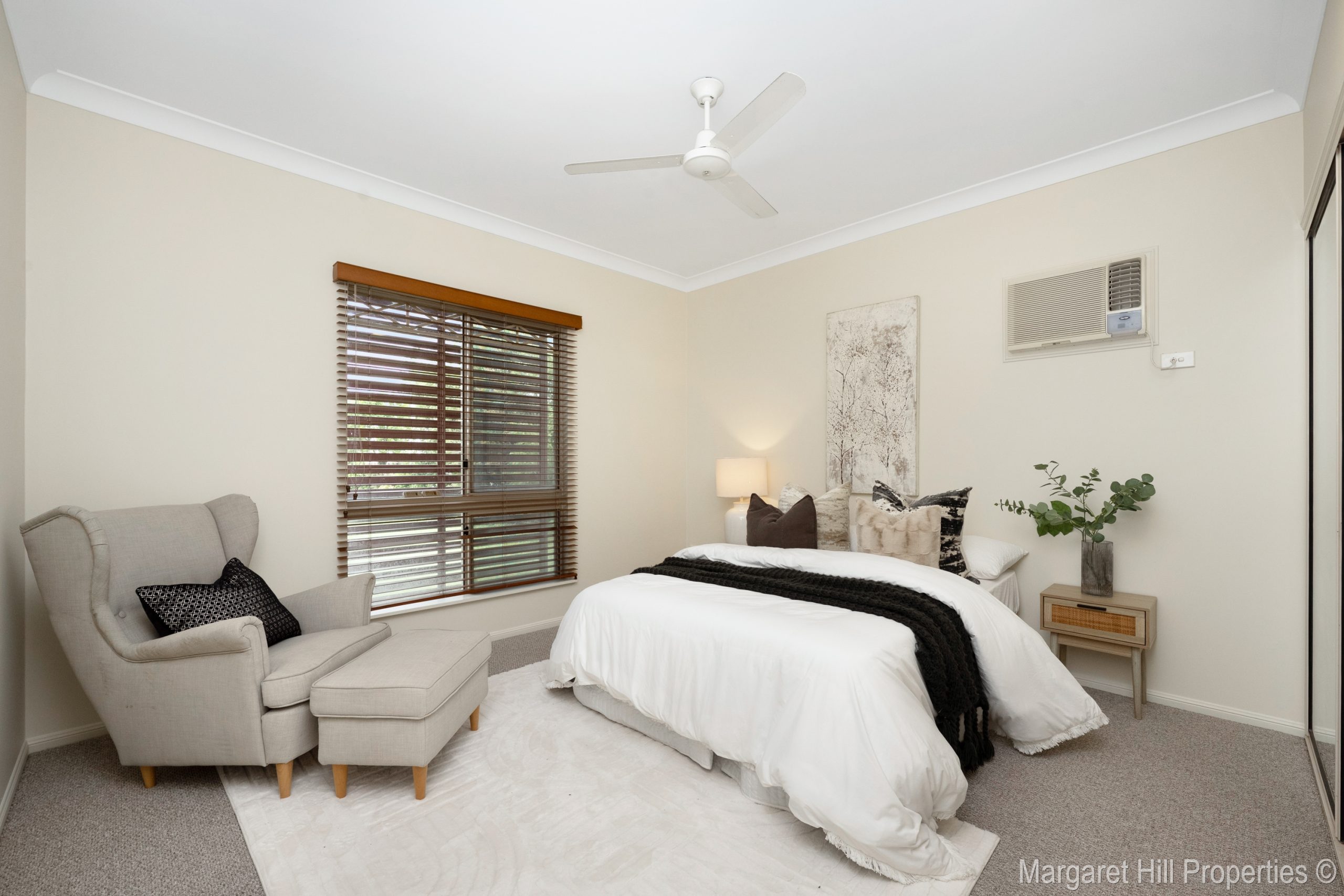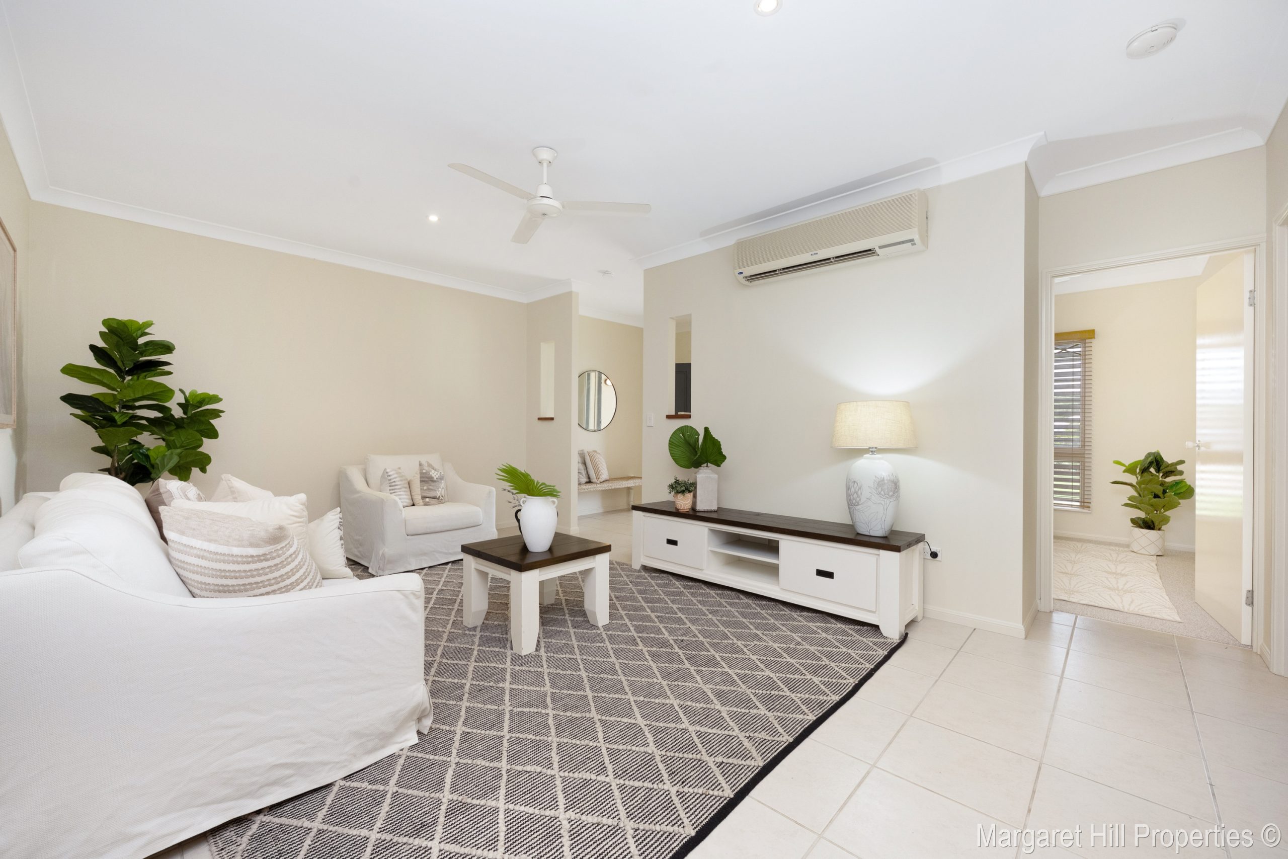 Entry via the front patio leads into the first of two living areas, a versatile zone from which three bedrooms branch off-perfectly suited as a family lounge, study area, or quiet retreat. All bedrooms are newly carpeted, feature built-in wardrobes, and two are air-conditioned.