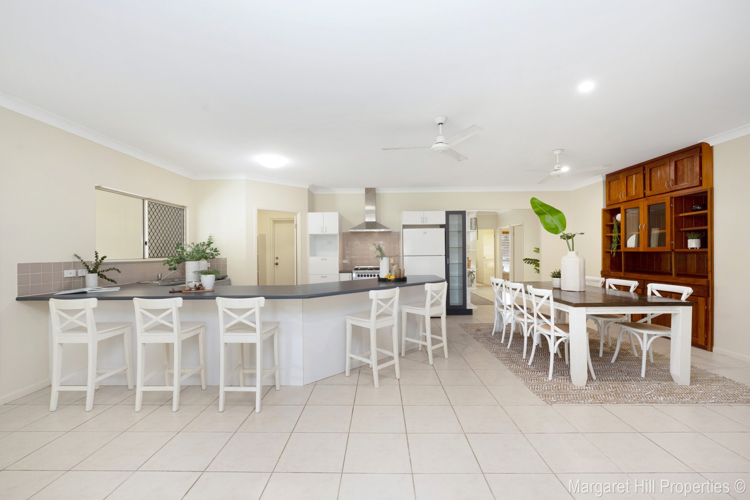 Centrally positioned, the kitchen is a standout. Cleverly designed with walk-through pantry access from the double lock-up garage, it offers extensive bench space, a dishwasher, pan drawers, microwave shelf, five-burner gas cooktop, built-in glass display cabinetry, and views over the pool-making it as practical as it is inviting.