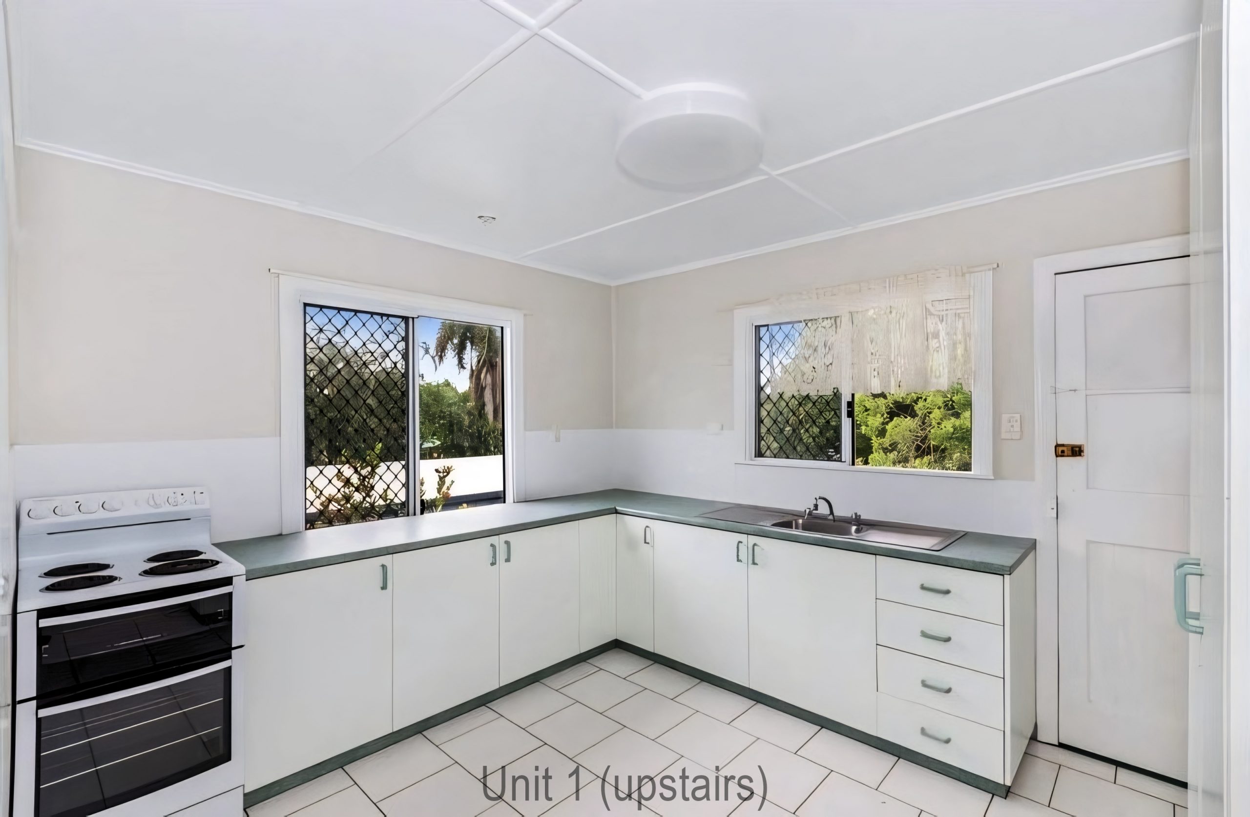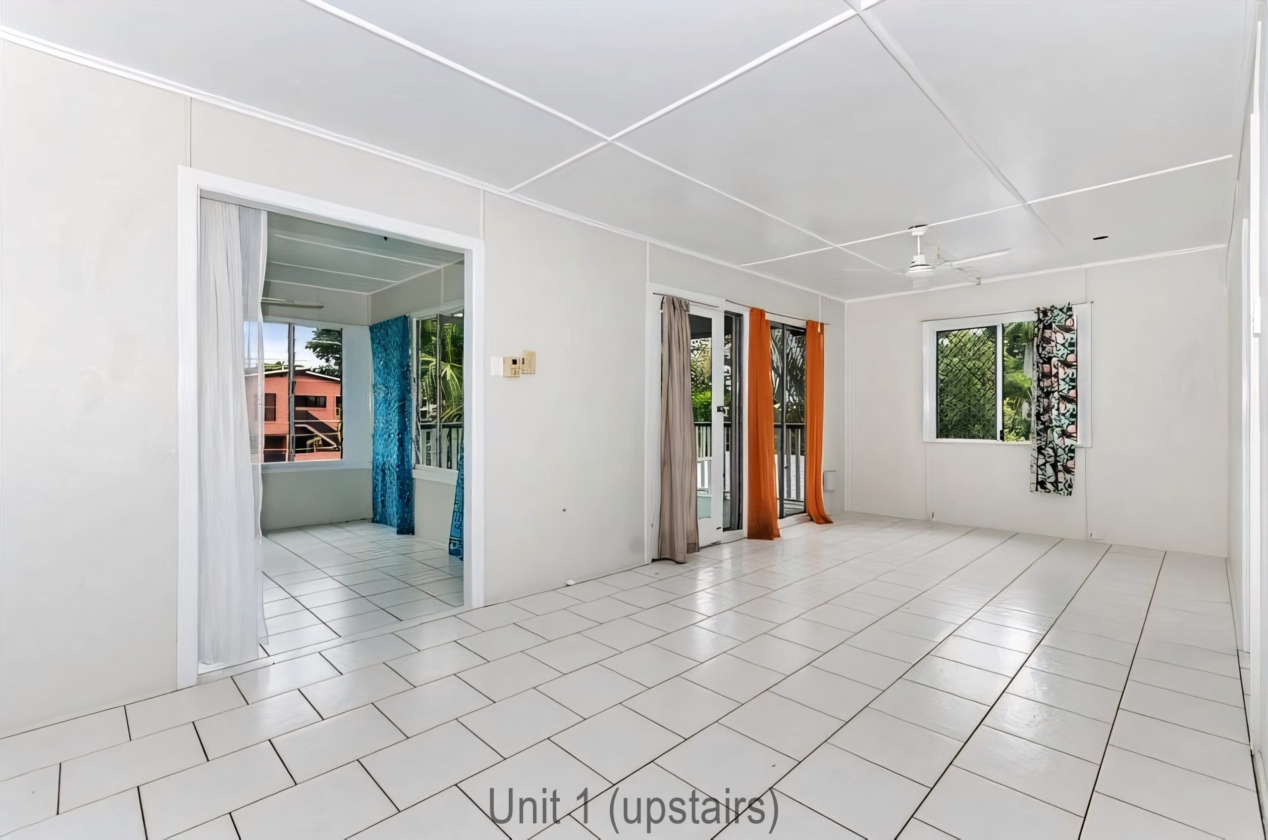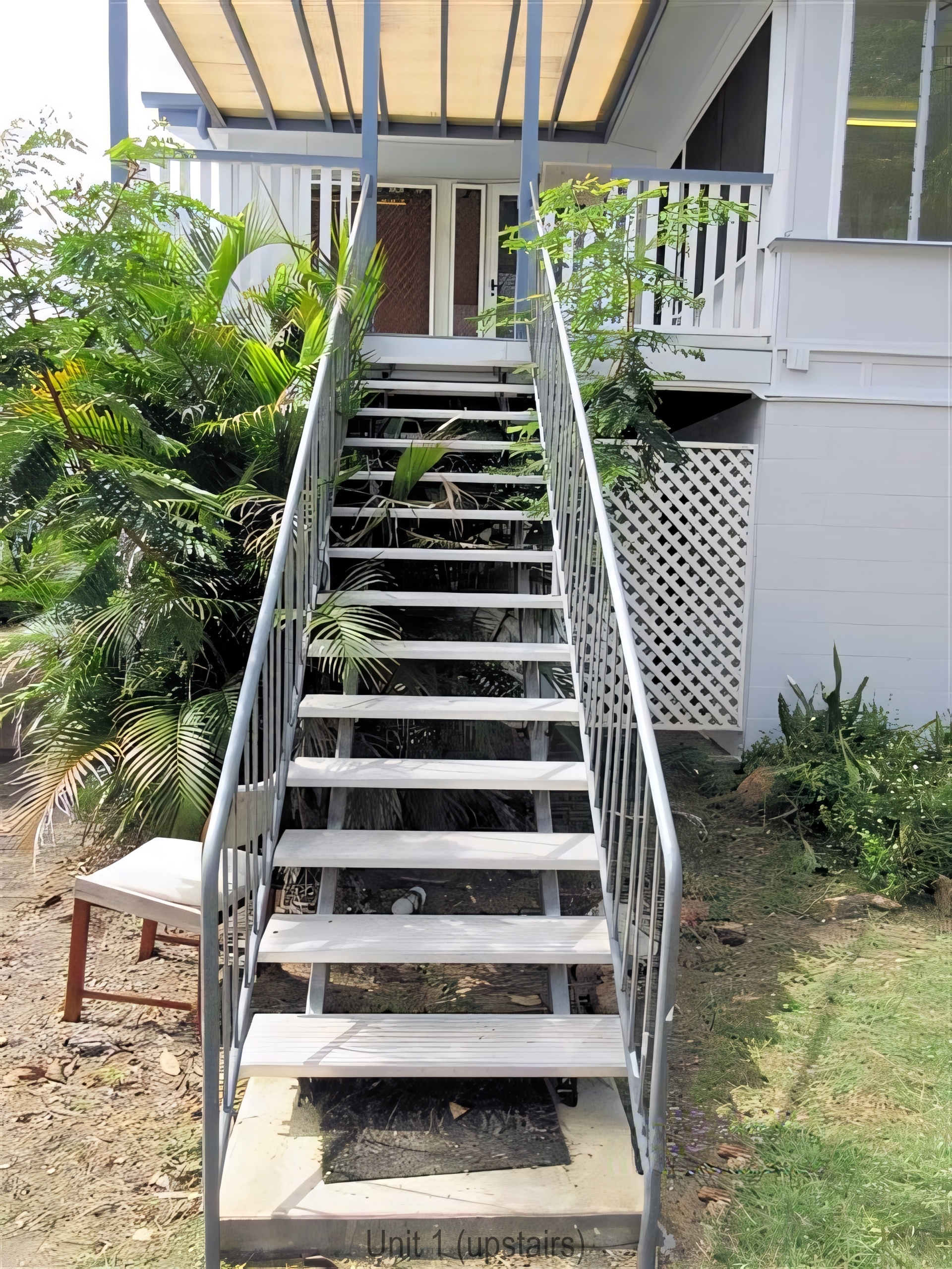 An elevated front balcony welcomes the tropical breezes and creates a charming introduction to the home. The crisp white-tiled, light-filled living area flows seamlessly into the kitchen, continuing out to the rear stairs for easy access to the partitioned backyard below.