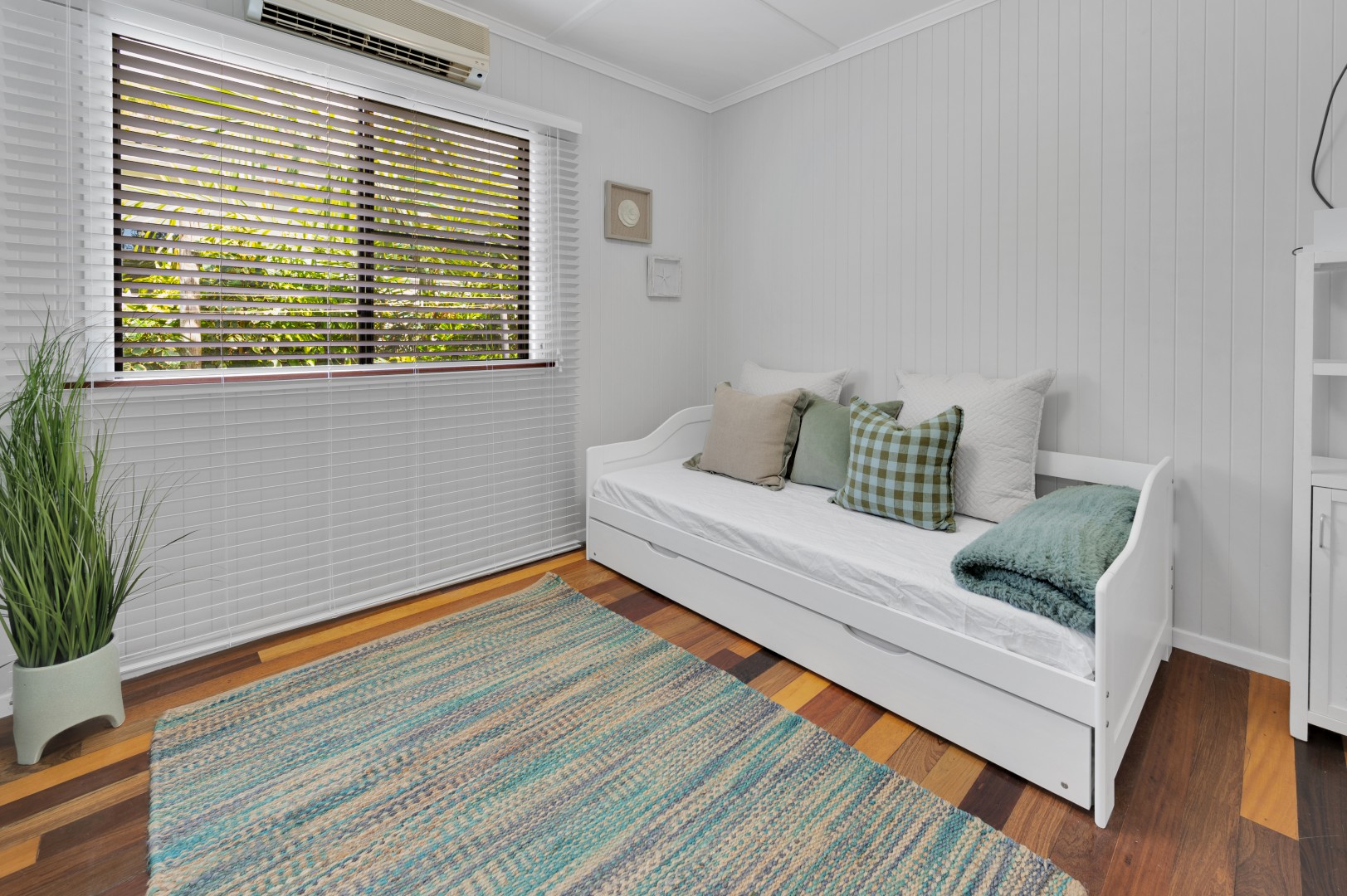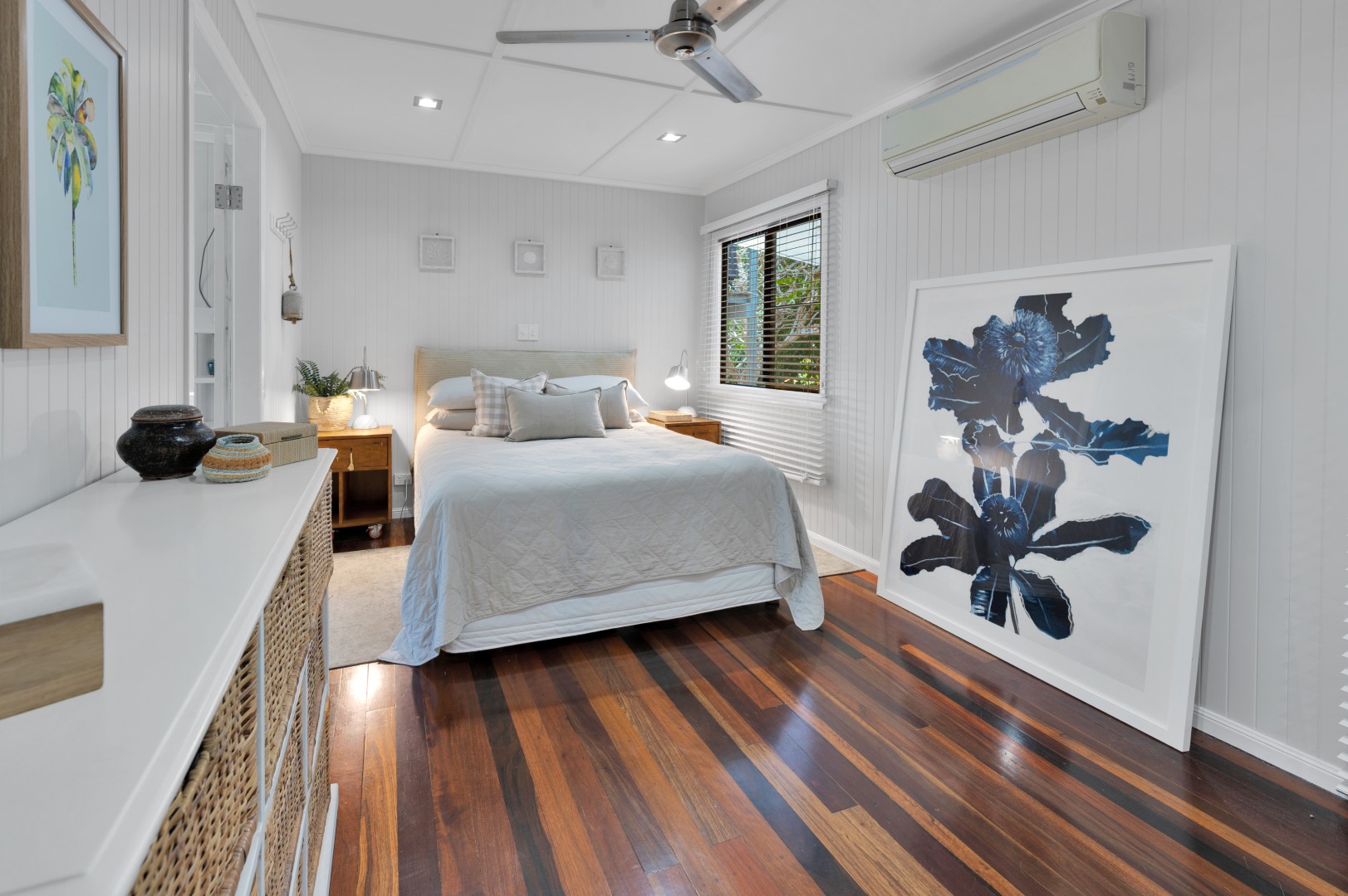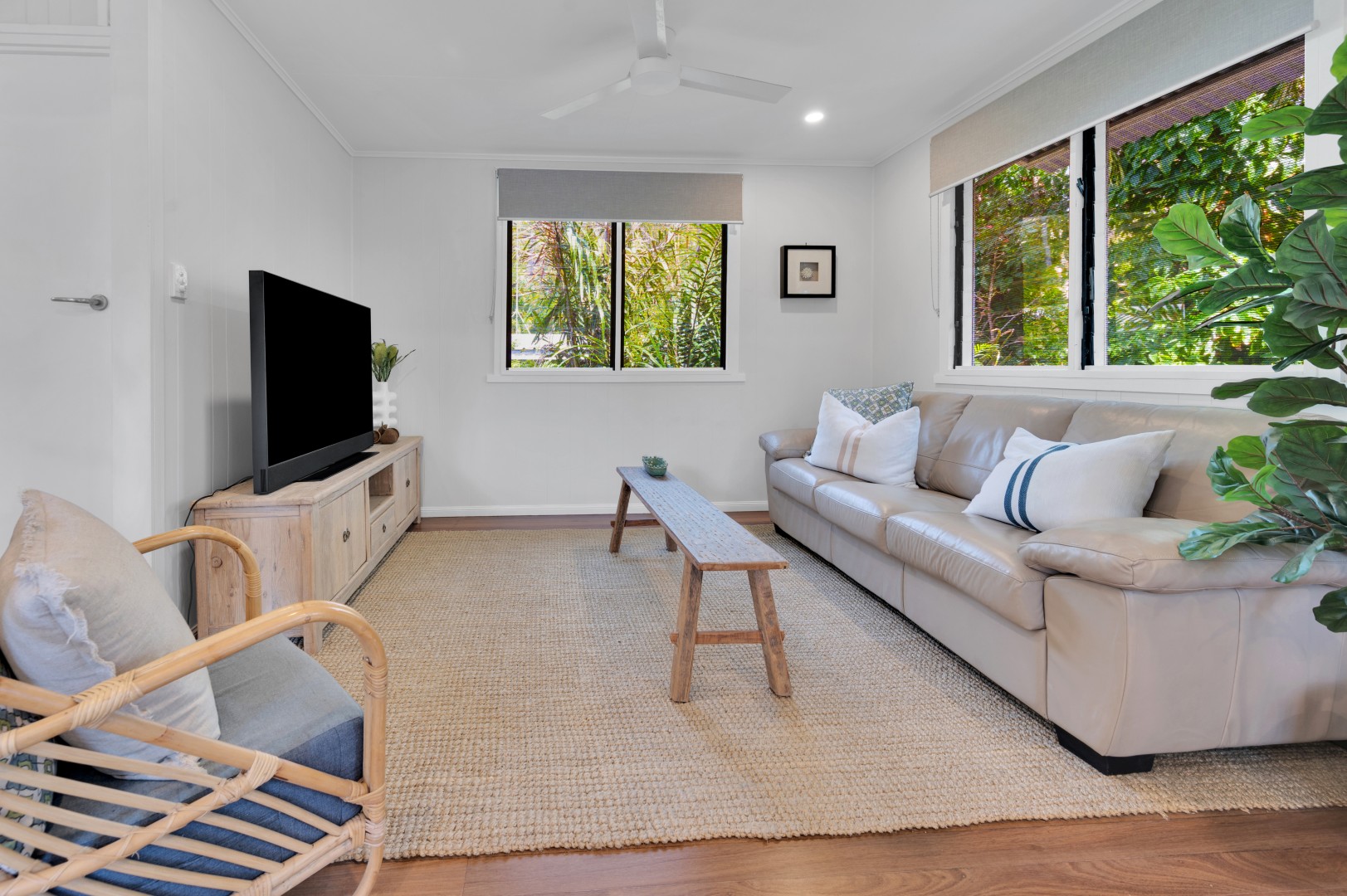 • Polished wooden floorboards give this area a warmth with neutral colours and louvered glass windows to let the natural light thought.