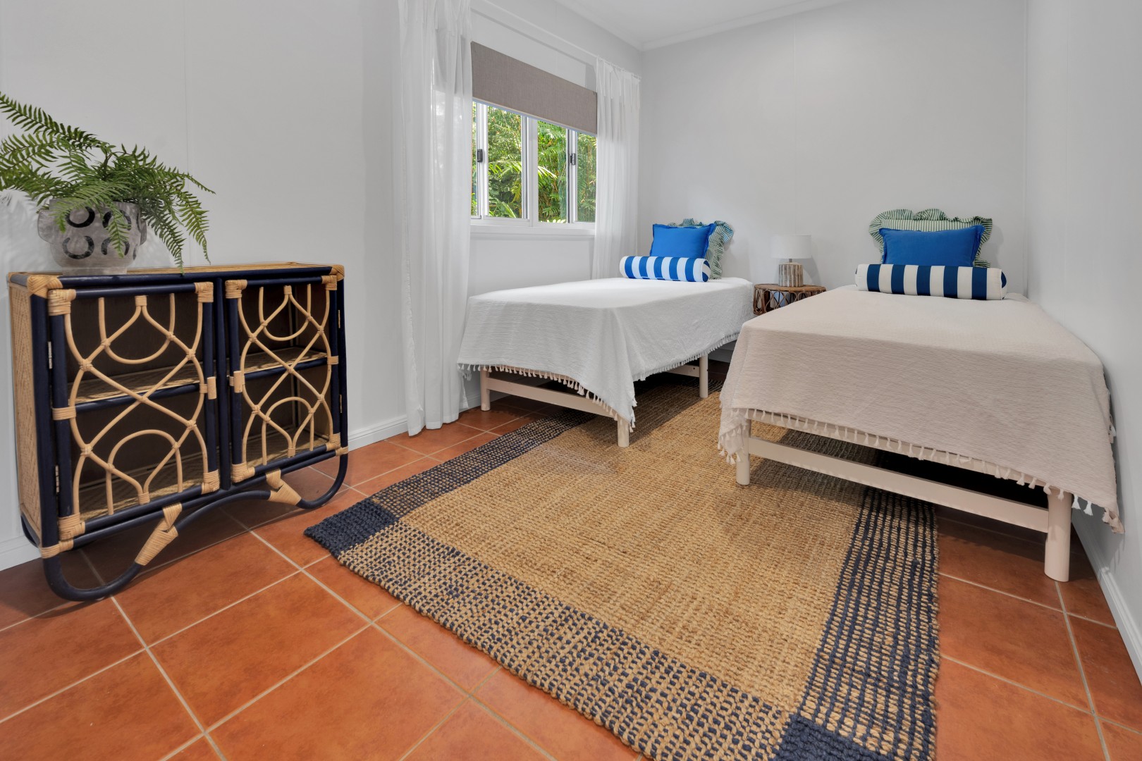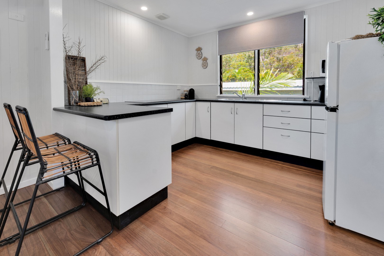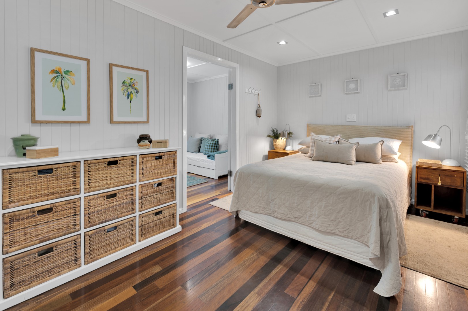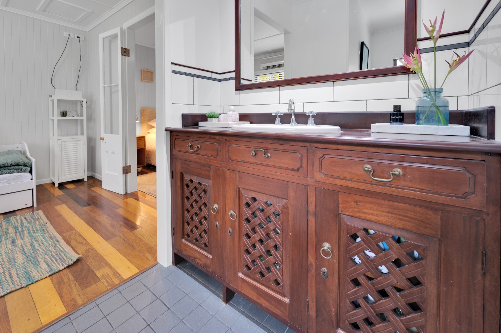 • Polished wooden floorboards give this area a warmth with neutral colours and louvered glass windows to let the natural light thought.