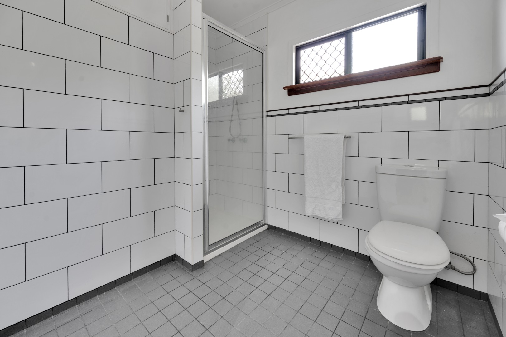 • Bathroom with shower, toilet and large timber vanity.