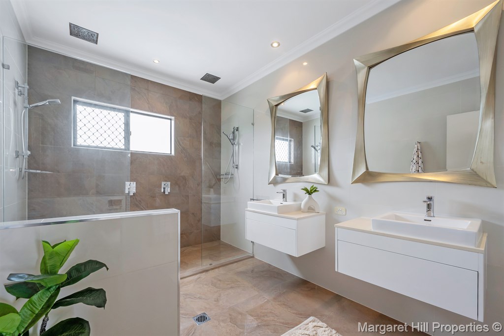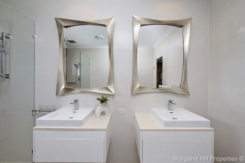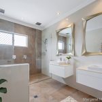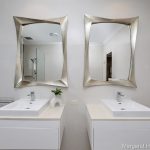 A designer ensuite with luxurious vanities and mirrors