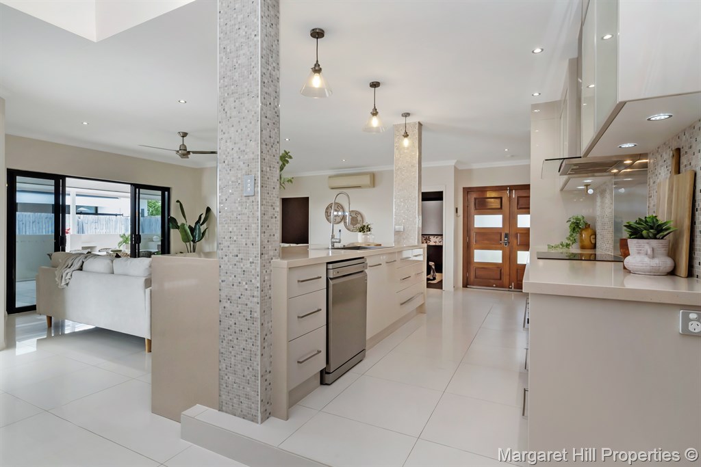 High-end appliances, including a dishwasher and space for a double fridge