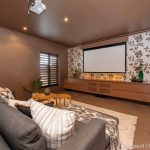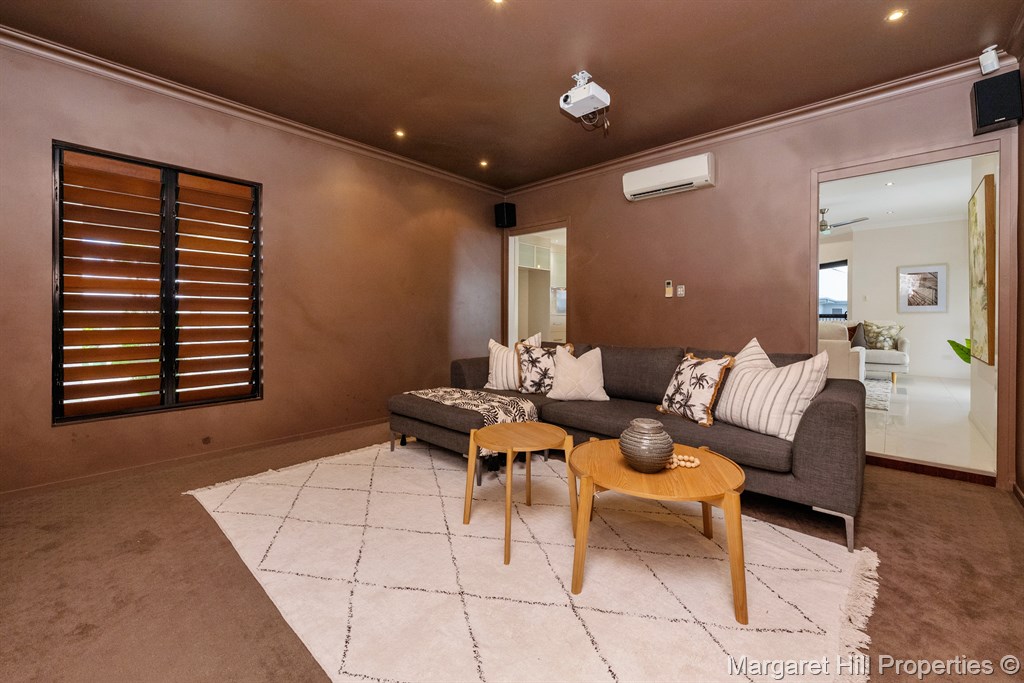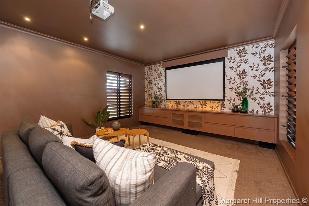 For movie nights, retreat to the luxurious theatre room-a cozy, intimate space adorned with designer wallpaper, timber louvres, and plush carpets.