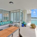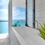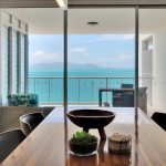 The open plan living and dining area flows seamlessly to the balcony with floor to ceiling sliding glass doors, capturing coastal breezes and stunning sea views.