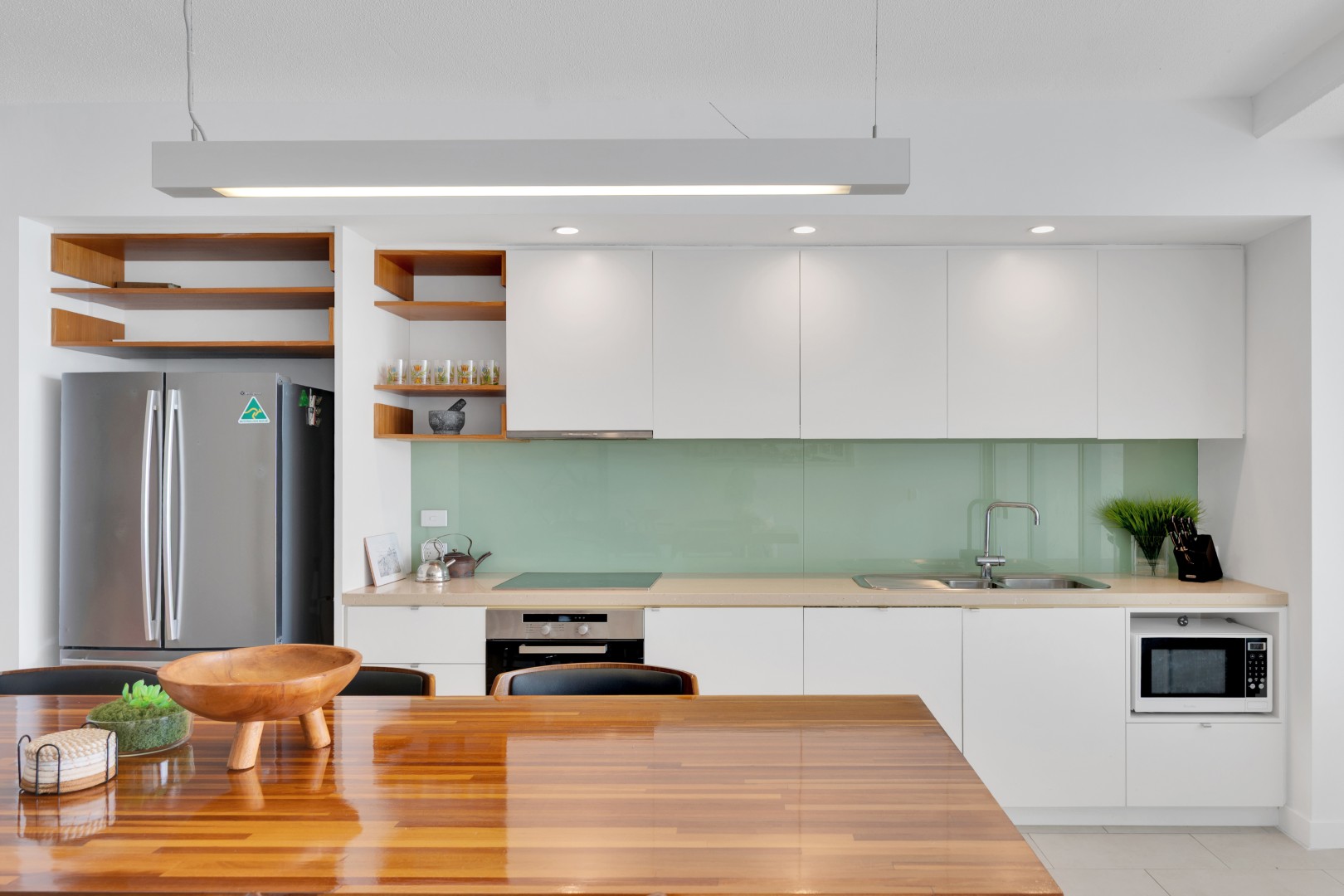 The open plan living and dining area flows seamlessly to the balcony with floor to ceiling sliding glass doors, capturing coastal breezes and stunning sea views.