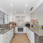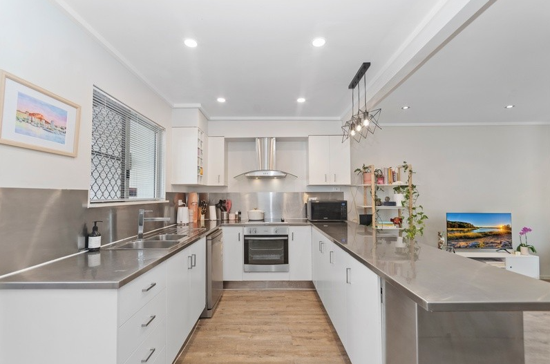 – A modern kitchen equipped with ample storage, modern appliances, and practical bench space