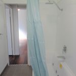 The family bathroom provides a shower over the deep tub. The vanity is modern and has a generous mirror above.